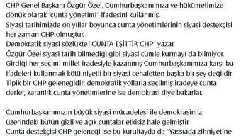 AK Parti Sözcüsü Ömer Çelik ise “Siyasi tarihimizde on yıllar boyunca cunta yönetimlerinin siyasi destekçisi her zaman CHP olmuştur.” dedi. “Demokratik siyasi sözlükte “cunta eşittir CHP” yazar. ” ifadelerini kullandı. Ve ekledi: “Girdiği her seçimi millet iradesiyle kazanmış Cumhurbaşkanımıza karşı bu ifadeleri kullanmak kötü niyetli bir siyasi cehaletten başka bir şey değildir. Tipik bir CHP geleneğidir; demokratik yollarla seçilmiş iradeye cunta derler, karanlık cunta yönetimlerine ise demokrasi diye bakarlar. Cunta destekçisi CHP geleneği bu kurultayda da “Yassıada zihniyetine biat” etmiştir.”